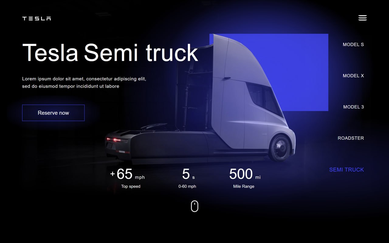 A modern animated Tesla landing page created using HTML, CSS and JavaScript. This project showcases smooth transitions, interactive navigation and a futuristic UI design.